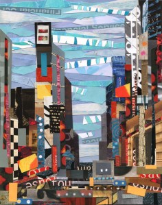 A collage made using mostly scraps and cuttings of printouts and photographs of my own work done over the years, from woven samples to water colours.