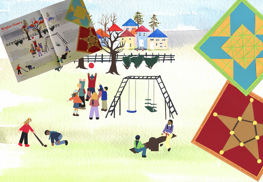 The image shows the background I created for a spread in the children’s magazine Kahani (see inset). Paper cut outs, torn paper and thread were used to create the children, trees, park and board games. These were then placed on a water colour background to complete the scene.