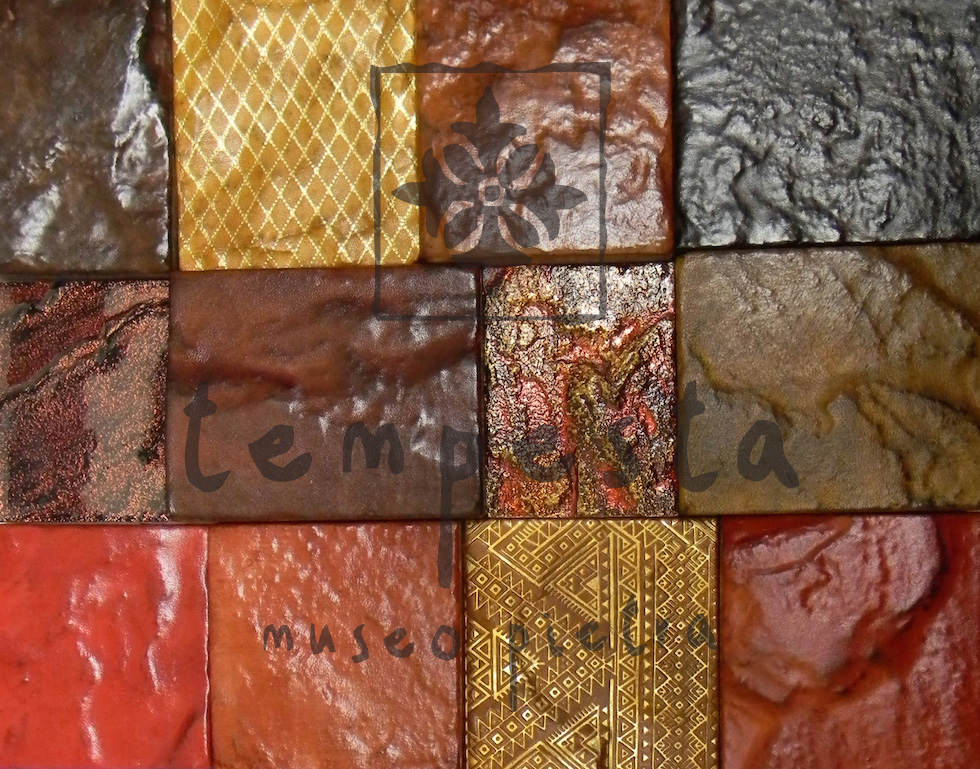 This collection is made up of an assortment of leather covered stone and stone tiles, some burnished, some tinted, some foiled and some glazed.